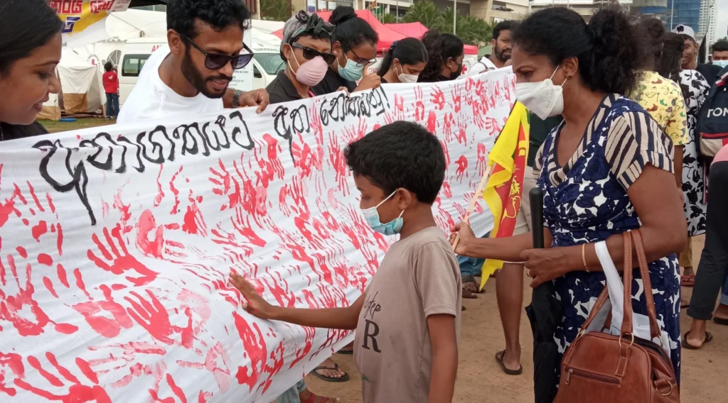 Students gave an appeal to all 225 Members of Parliament urging them to put child protection at the heart of the national security agenda. Here the students are outside the Parliament of Sri Lanka holding a mural drawn by children.